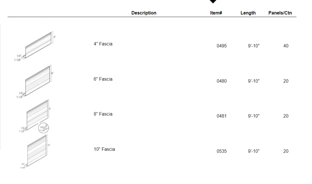 Kaycan’s premade aluminum Ribbed Fascia is made in 4 sizes. (4″, 6″, 8″, 10″)